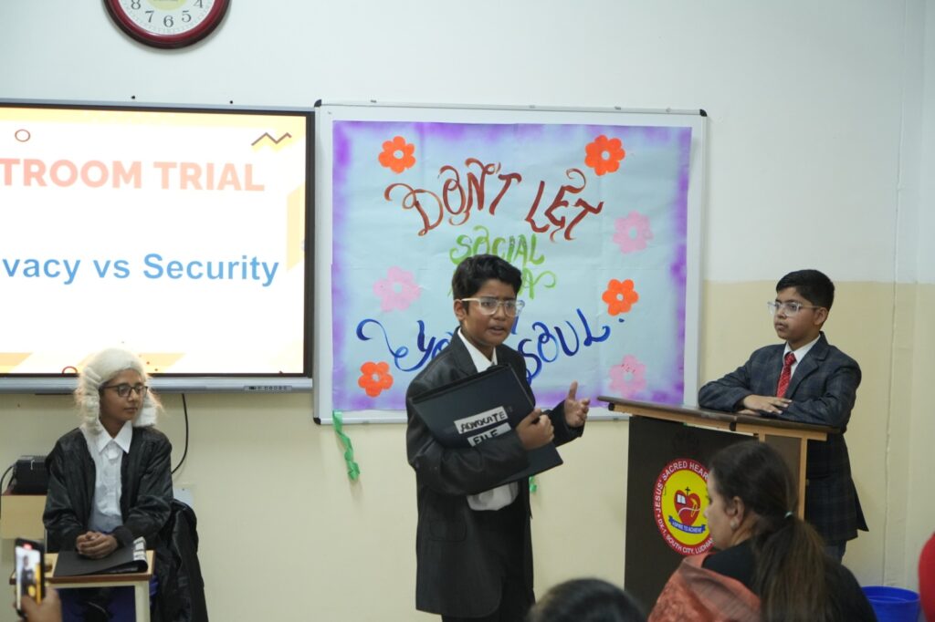 One of the highlights of the presentations was a powerful role play titled ‘Reel VS Real’, which illustrated the stark contrast between the curated lives portrayed on social media and the realities experienced by children. Another gripping performance came in the form of a mock courtroom trial, where students re-enacted well-known cases of data breaches and privacy violations, raising awareness about cyber safety.